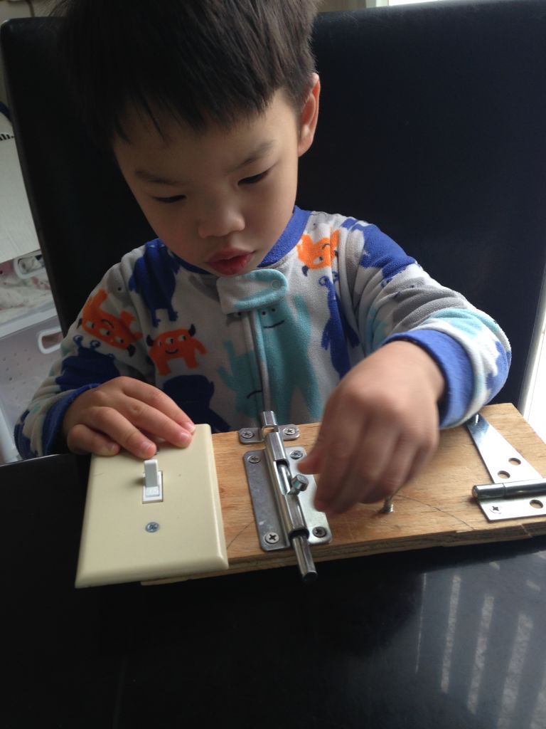 My handy father-in-law made this for the boys. He bolted down the four “spare” items he had in his garage. He had a light switch, a sliding door lock, a hook lock and a metal hinge. This activity board never fails to entertain my boys for long periods of time. They both individually sit and work on this board for over 30 minutes each.