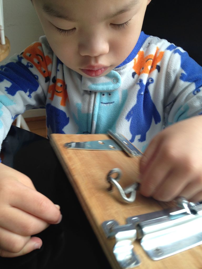 For his second attempt (on another day), he interestingly worked on the sliding door lock. I showed him how to use to turn the handle, place it in the space and slide it down. I then showed him how to “lock” it by sliding it up with the handle. But he couldn’t seem to quite get the “locking back up” part. He would successfully use the handle to “open” it (in the same way I showed him) but he decided it was easier to push the lock back up with his pointer finger from the bottom. Then turn the handle off to side to make sure he locks it. He was definitely getting those little fingers moving!